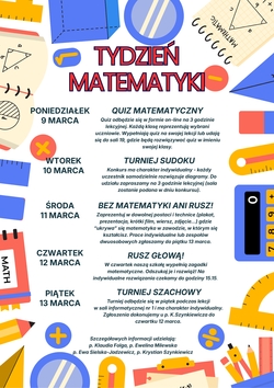 Tydzień Matematyki w naszej szkole odbędzie się w dniach 9-13 marca. W tym czasie uczniowie wszystkich klas mogą wziąć udział w różnych konkursach i aktywnościach matematycznych.
